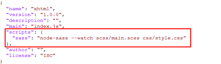 Everything is ready to write a small script in order to compile Sass. Open the package.json file in a code editor. You will see something like this: In the scripts section add an scss command